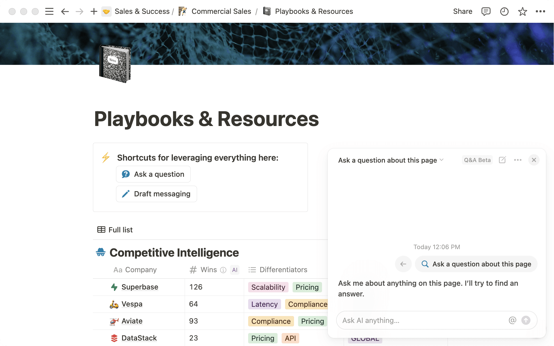 When sellers are on calls with customers they need instant access to the knowledge in your battle cards, competitive analysis, roadmap, and more. With Notion AI, all they need to do is ask a question, and they’ll get an instant response.
