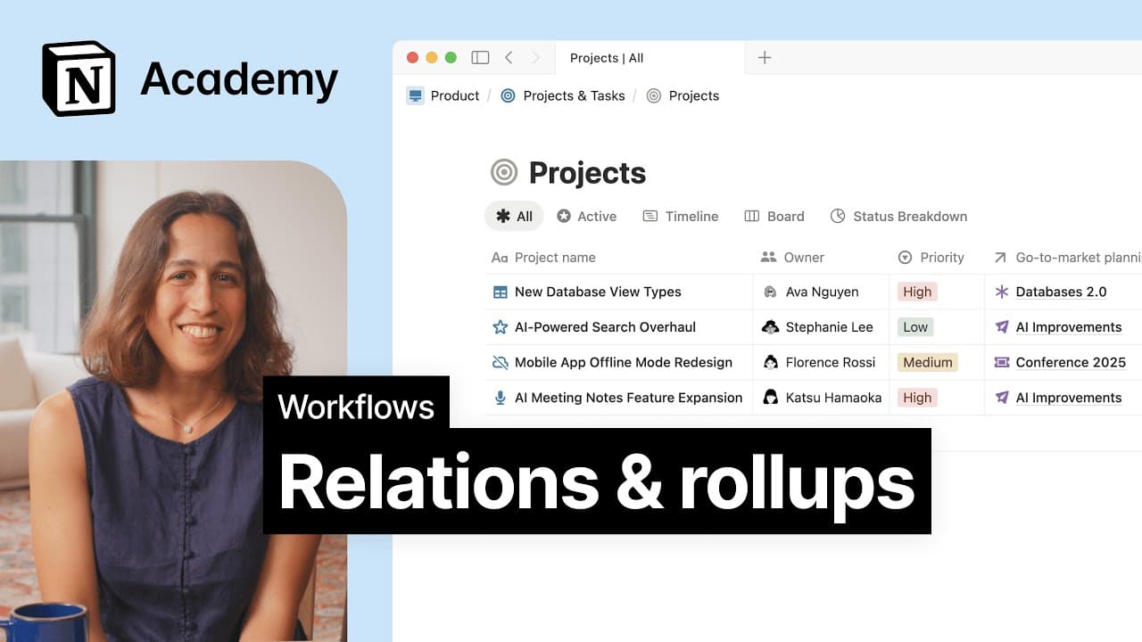 Relación | Conecta bases de datos y menciona páginas de bases de datos. Útil para conectar elementos en tu espacio de trabajo. Obtén más información aquí → |